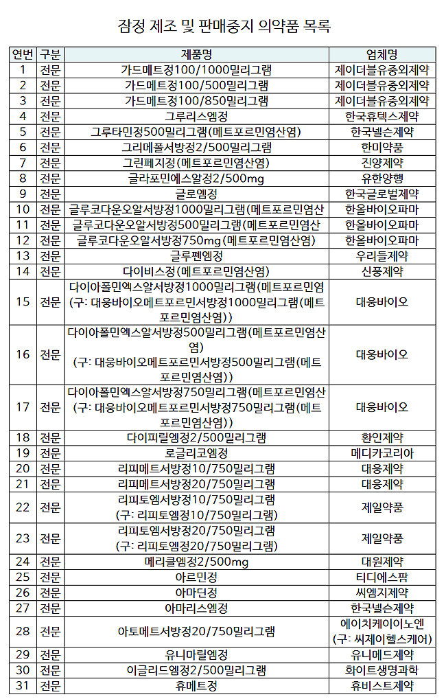 발암 추정 물질 검출 당뇨병약 31개 목록 품목 (메트포르민 당뇨약 잠정 판매중지 의약품)